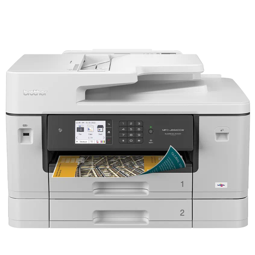 La Brother MFC-J6940DW es una multifuncional de inyección de tinta a color de alto rendimiento, diseñada para oficinas y negocios que requieren impresión en formato doble carta (A3/Ledger). Ofrece funciones de impresión, escaneo, copiado y fax, con impresión dúplex automática y conectividad avanzada mediante USB, Ethernet y Wi-Fi dual band. Con velocidad de hasta 25 páginas por minuto en negro y color, resolución de hasta 1200 × 4800 dpi y bandeja de entrada de gran capacidad, garantiza productividad y calidad profesional. Compatible con Brother Mobile Connect y aplicaciones de impresión móvil.